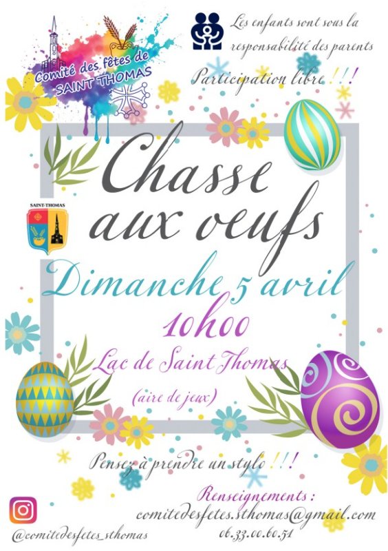 Chasse aux œufs 16 mars 2026 Le jour de Pâques, le comité des fêtes de SAINT-THOMAS organise une chasse aux œufs pour les enfants :