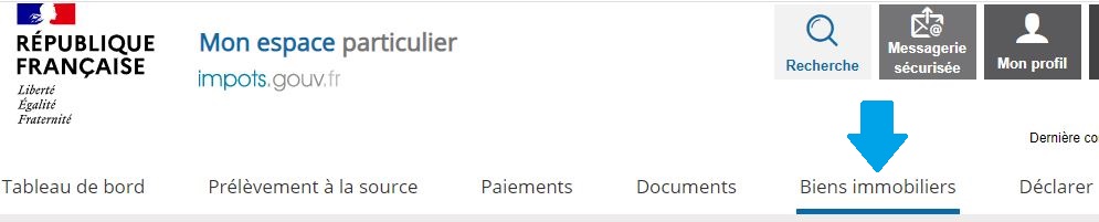 Sur la page d’accueil, il faut sélectionner le menu « Biens immobiliers » souligné en bleu dans l’illustration ci-dessous :