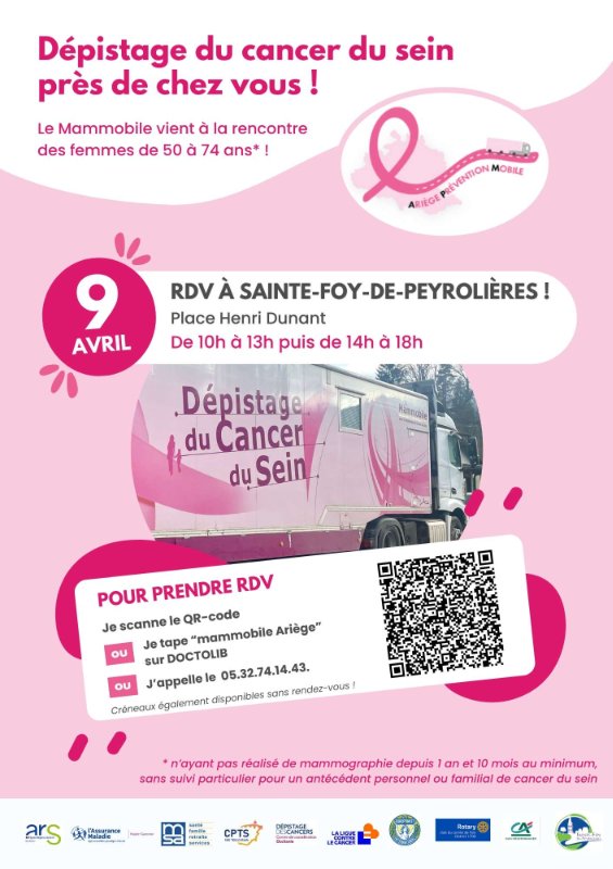 Dépistage "cancer du sein" 26 mars 2025 Une MAMOBILE sera présente sur la commune voisine le mercredi 9 avril 2025 . Ce message s’adresse donc aux femmes de la tranche d’âge mentionnée dans le flyer ci-dessous :