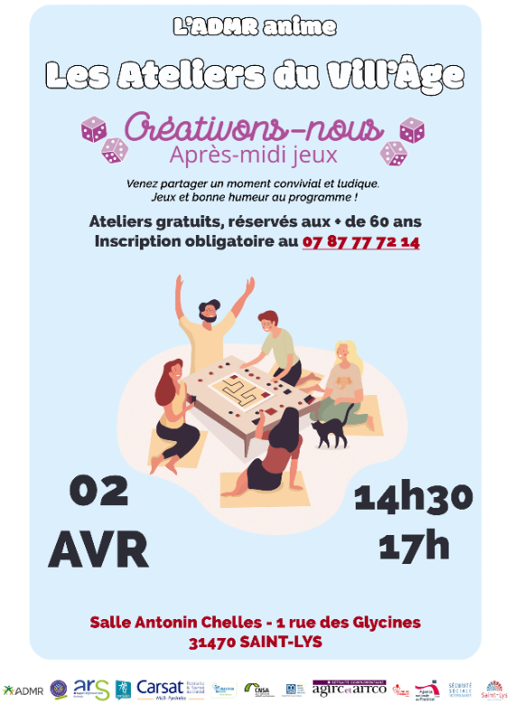 Les Ateliers du vill’âge par l’ADMR 24 mars 2026 Vous avez plus de 60 ans, venez partager un moment convivial et ludique. Le jeudi 2 avril de 14h30 à 17h. Jeux et bonne humeur au programme. Atelier gratuit, inscription obligatoire au 07 87 77 72 14