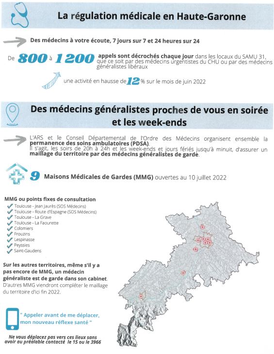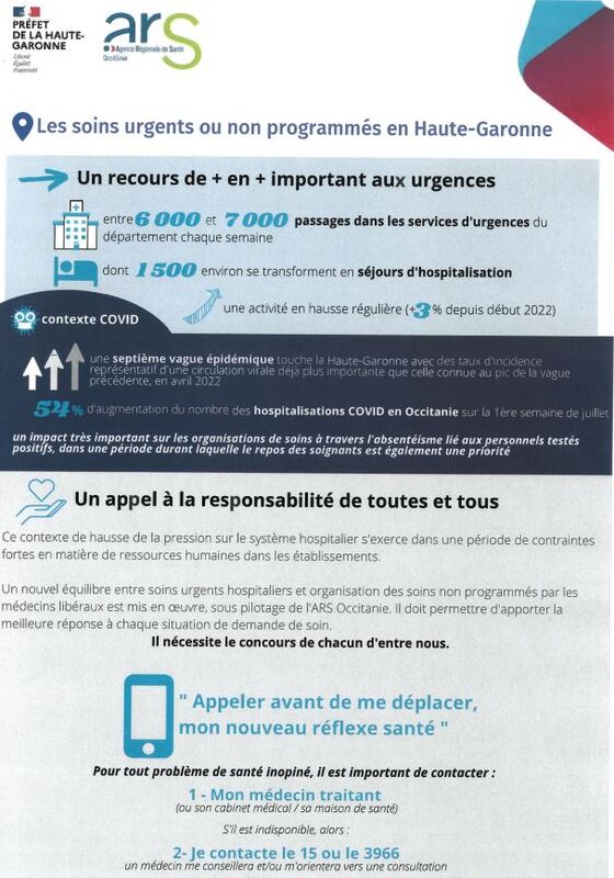 Face à la problématique du manque de personnels en milieu hospitalier et à l’affluence de patients dans les services des « URGENCES », alors que pour certains d’entre eux, le déplacement aurait pu être évité, l’ ARS lance un appel à la responsabilité de tous pour nous inciter à d’abord solliciter le médecin traitant puis à défaut, à appeler le 15 ou le 3966.