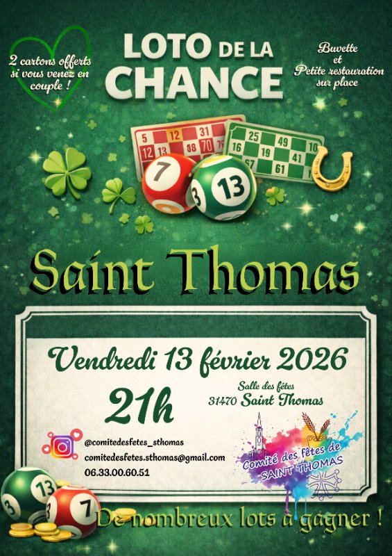 Loto de la chance 4 février 2026 Le comité des fêtes de SAINT-THOMAS organise une manifestation le vendredi 13 février à la salle « JEAN PUJOS » :